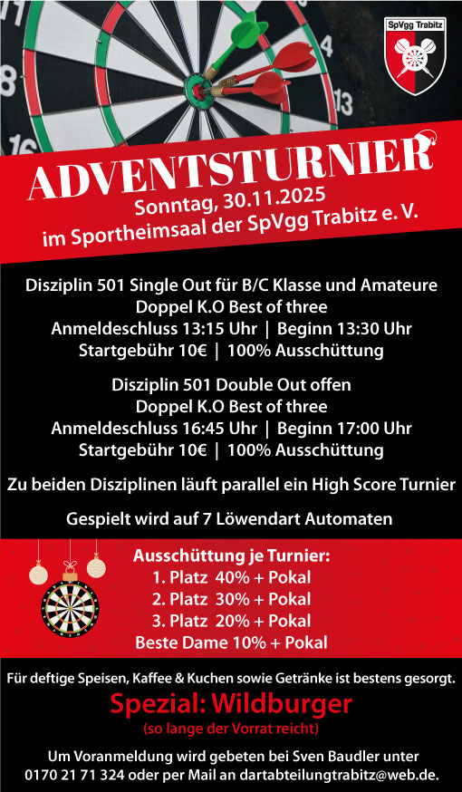 Am Sonntag, den 30. November 2025, veranstaltet die Dartabteilung der SpVgg Trabitz e. V. ihr traditionelles Adventsturnier im Sportheimsaal in Trabitz. Gespielt werden die Disziplinen 501 Single Out für B/C-Klasse und Amateure sowie 501 Double Out offen, jeweils im Doppel-K.O.-Modus Best of Three. Der Anmeldeschluss für das erste Turnier ist um 13:15 Uhr, Beginn ist um 13:30 Uhr. Das zweite Turnier startet um 17:00 Uhr, der Anmeldeschluss hierfür ist um 16:45 Uhr. Die Startgebühr beträgt jeweils 10,00 €, die Ausschüttung je Turnier erfolgt zu 100% wie folgt: beträgt 40 % für den ersten Platz, 30 % für den zweiten Platz, 20 % für den dritten Platz sowie 10 % für die beste Dame. Zusätzlich erhalten alle Gewinner/innen noch einen Pokal.